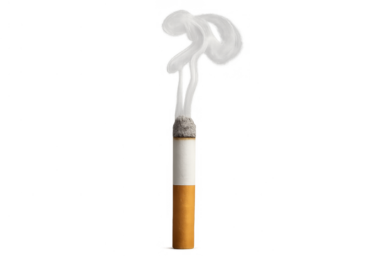 Smoking cigarette burning with thick smoke and ash, symbolizing addiction, unhealthy habits, and health risks, on a transparent background