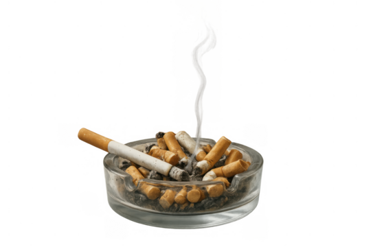 Ashtray full of cigarette butts with lit cigarette, representing addiction and health risks, on transparent background