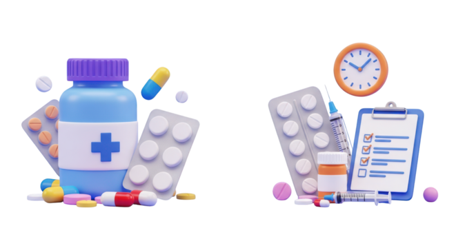 Medical supplies and healthcare items arranged with clock isolated on a transparent background