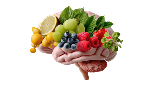 Brain Fuel: Conceptual still life featuring a human brain overflowing with fresh, vibrant fruits and vegetables, a metaphor for a healthy diet nourishing the mind.