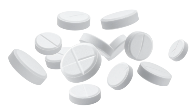 Collection of white round pills with a cross inscribed on them, scattered in the air