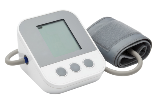 Digital blood pressure monitor with grey cuff for home healthcare isolated on a transparent background