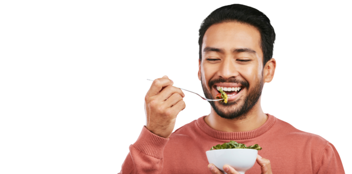 Smiling man eating avocado with a spoon, isolated on transparent background