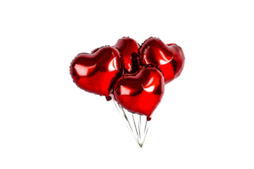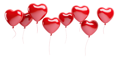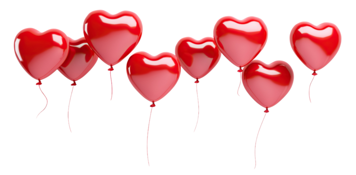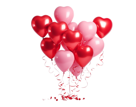 Valentine's day background with red and pink hearts like balloons on white background, flat lay, clipping path. PNG