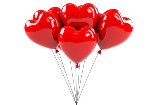 A cluster of shiny red heart-shaped balloons floating against white transparent background, symbolizing love and celebration of Valentine Day