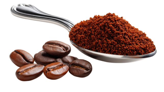 Aromatic Coffee Delights: A spoon laden with rich, instant coffee crystals, complemented by a cluster of whole coffee beans, inviting a sensory exploration into the heart of the beverage's appeal.