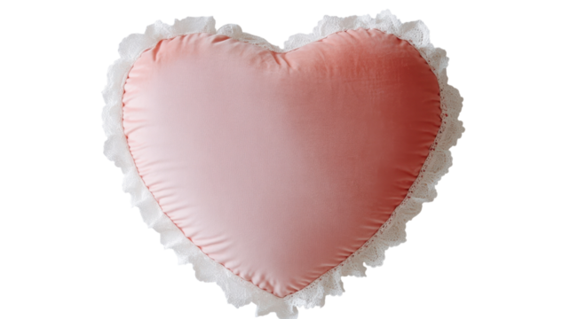 Heart-shaped pillow with delicate lace trim, perfect for home decor, comfort, and style, isolated on white background.