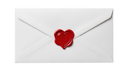 White envelope featuring a prominent red heart wax seal, symbolizing love and sending a secret message. Transparent background