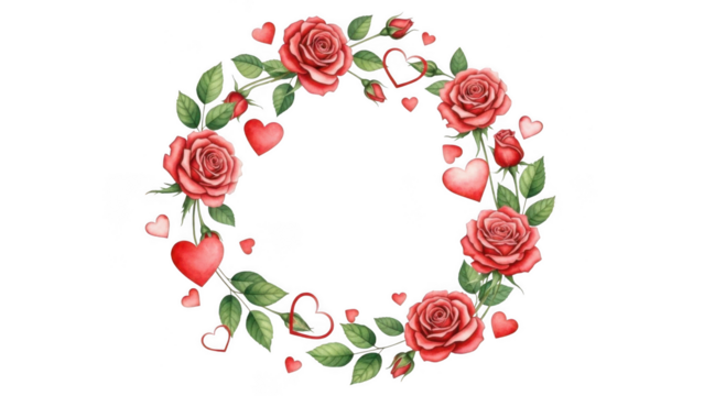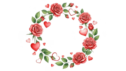 Floral wreath with roses and hearts isolated on transparent background