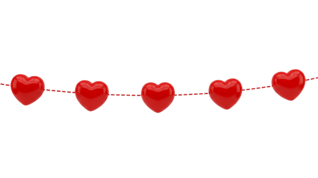 Five Shiny Red Hearts Garland Hanging Decoration Isolated on Transparent Background