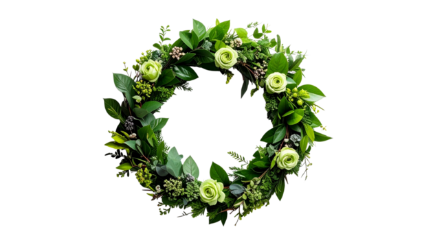 Elegant greenery wreath home floral arrangement top view isolated on solid white background1