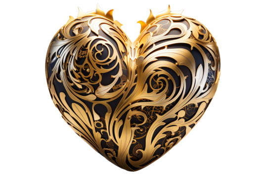 Intricate golden heart design with swirls, perfect for representing love and affection, isolated on a white background.