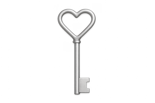 Silver key with ornate heart-shaped bow isolated on transparent background