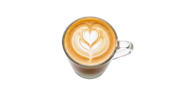 Latte art isolated PNG, coffee drink with heart and leaf pattern on transparent background, cafe beverage for menu and design