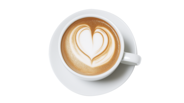 Top view of latte coffee with heart latte art isolated on white transparent background