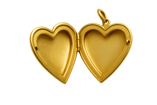 Golden heart-shaped locket dangling on delicate chain, open and vacant, symbolizing personal storytelling against transparent backdrop