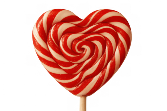 Red and white swirl heart lollipop on stick, representing love, sweetness, and valentine's day celebrations