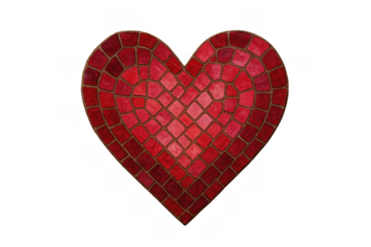 Intricate stained glass heart with red and pink tones, metal framing isolated on white transparent background, symbolizing love, passion, and art