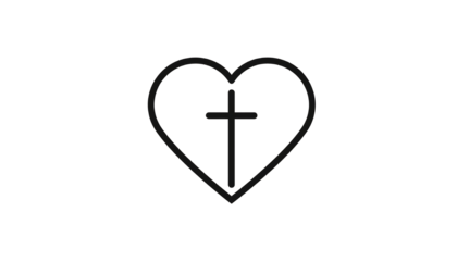 Heart shape containing a centered christian cross, all depicted in black lines on a white background, cutout