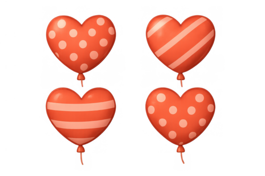 Four vibrant red heart-shaped balloons featuring polka dot and stripe patterns, creating a festive display for celebration, isolated with a transparent background