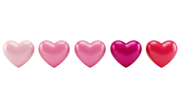 A cluster of heart shaped balloons in shades of pink and red floats against a white backdrop.
