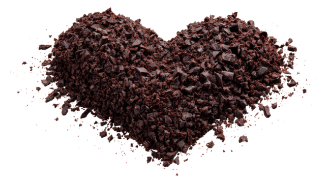 Heart shaped chocolate crumbs heap isolated on transparent background nobody