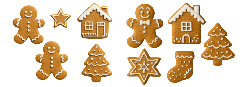 Collection of Christmas cookies shaped like stars, trees, and hearts decorated with icing isolated on white background
