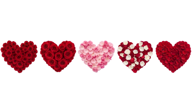 Five heart shapes made of roses in various shades of red and pink on transparent background