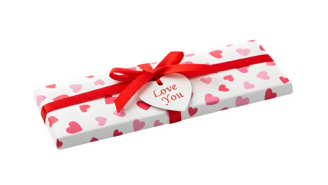 A beautifully wrapped white gift box with a vibrant red ribbon and a heart shaped tag with the word love