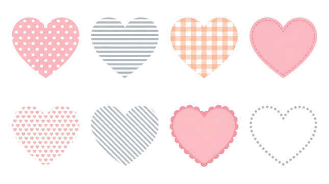 Valentine heart set including paper, origami, stitched, striped, and scalloped variants isolated. Romantic decoration and craft collection.