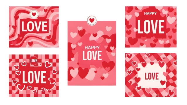 Collection of five unique valentines day greeting cards featuring love theme with various red heart patterns and designs on transparent background. on transparent background