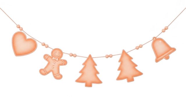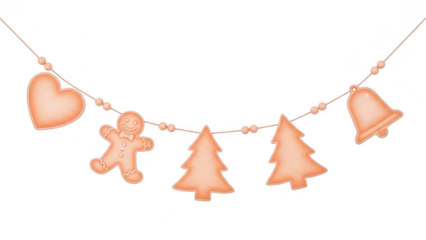Christmas garland decoration with heart gingerbread man trees and bell hanging on string isolated on transparent background
