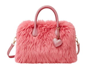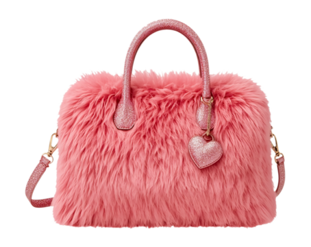 Pink furry handbag with heart zipper charm. Glamorous Y2K girly style. Sparkly glitter texture, glossy highlights, soft shadows. PNG. For stickers, fashion graphics, branding, social media, banners