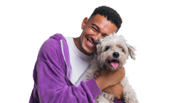 Joyful Companion: A smiling person embraces a fluffy dog, capturing a heartwarming moment of friendship and love.