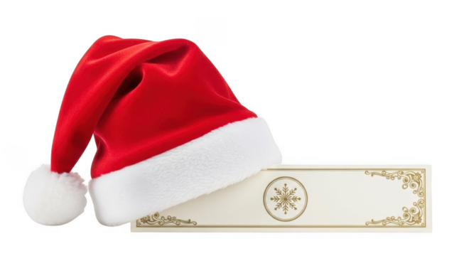 Festive Greetings: A bright Santa hat rests alongside a decorative banner, creating a heartwarming holiday scene.