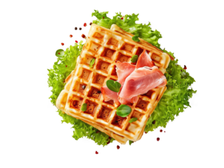 Dutch waffles with bacon for breakfast on transparent background, top view, png