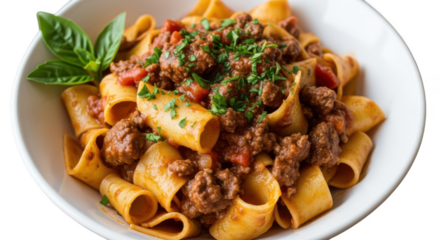 Hearty paccheri pasta with rich bolognese sauce isolated on transparent background