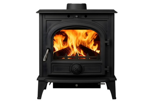 Black wood burning stove with fire isolated on transparent background