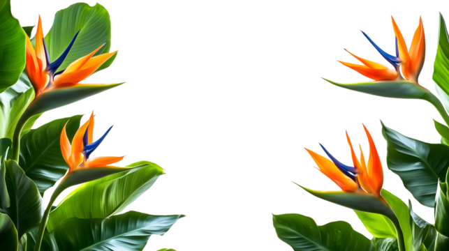 Striking bird of paradise plant featuring vibrant blooms and lush green foliage set against a deep transparent background
