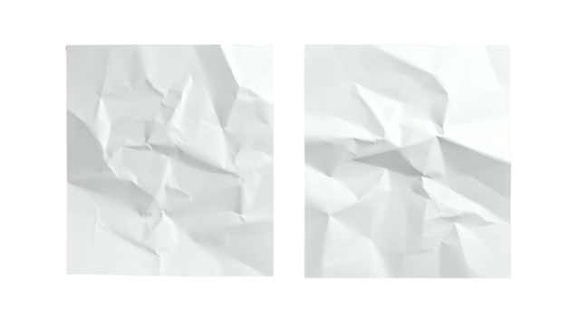 Two rectangular sheets of white paper, heavily crumpled, set against a black background