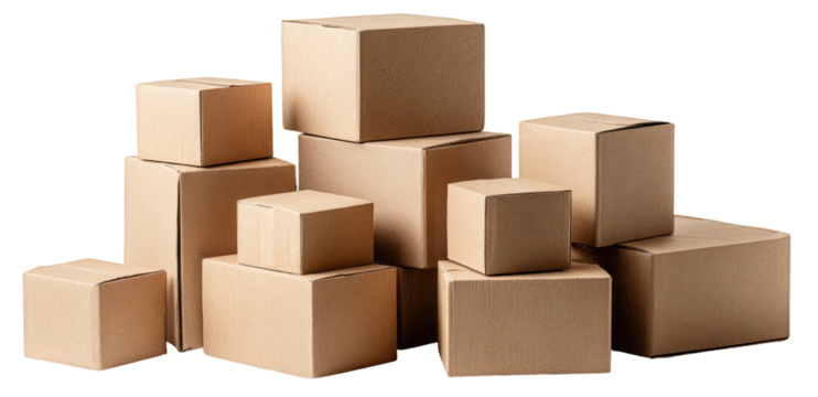 A stack of cardboard boxes of varying sizes are piled in a heap against a plain black background