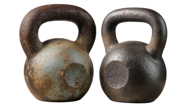 An isolated old rusty iron dumbbell and heavy metal weight equipment for bodybuilding and strength training on a white fitness background
