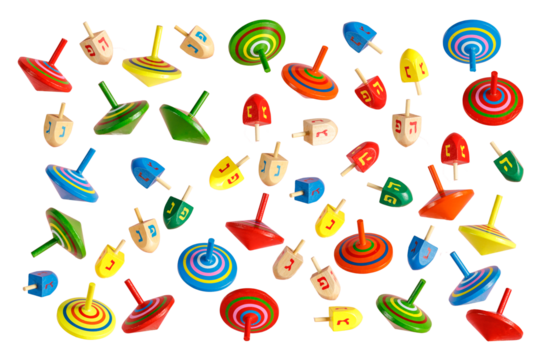 Colorful wooden dreidels with Hebrew letters in a row, isolated, PNG