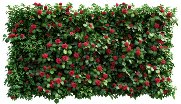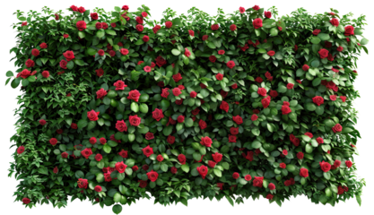 Wall panel of vibrant blooming roses surrounded by lush green leaves, cut out