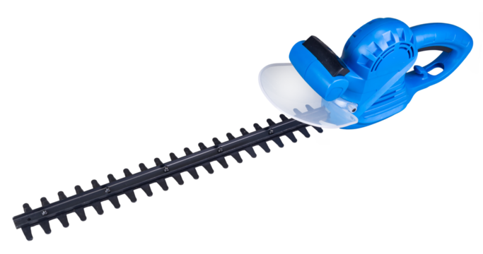 blue electric hedge trimmer sharp blades for trimming and shaping bushes. diy gardening tool isolated  white background