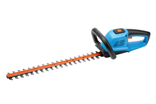 Gas-powered hedge trimmer with dual action blades and safety handle for efficient gardening. Cut out PNG
