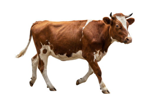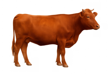 Brown cow standing, looking right, domestic animal on transparent background, livestock farming, agriculture