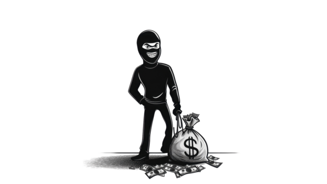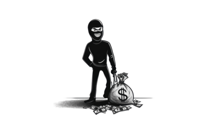 The Heist: A masked thief makes a daring escape, clutching a heavy sack of cash, his face obscured by shadows in a suspenseful moment of criminal activity.