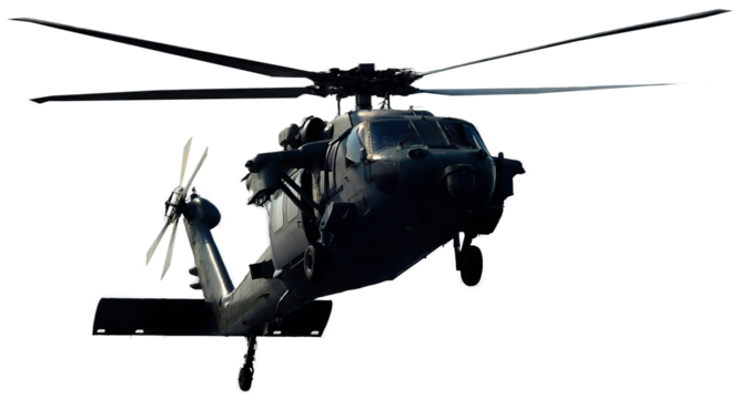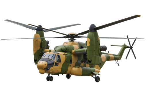 Large military helicopter in flight, isolated on a white background. The helicopter has a rugged