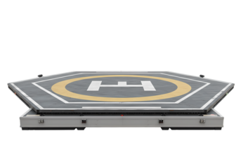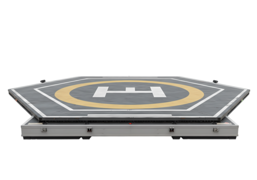 Rooftop helipad with yellow circular and linear markings and a flagpole on a dark background helicopter isolated on a transparent background